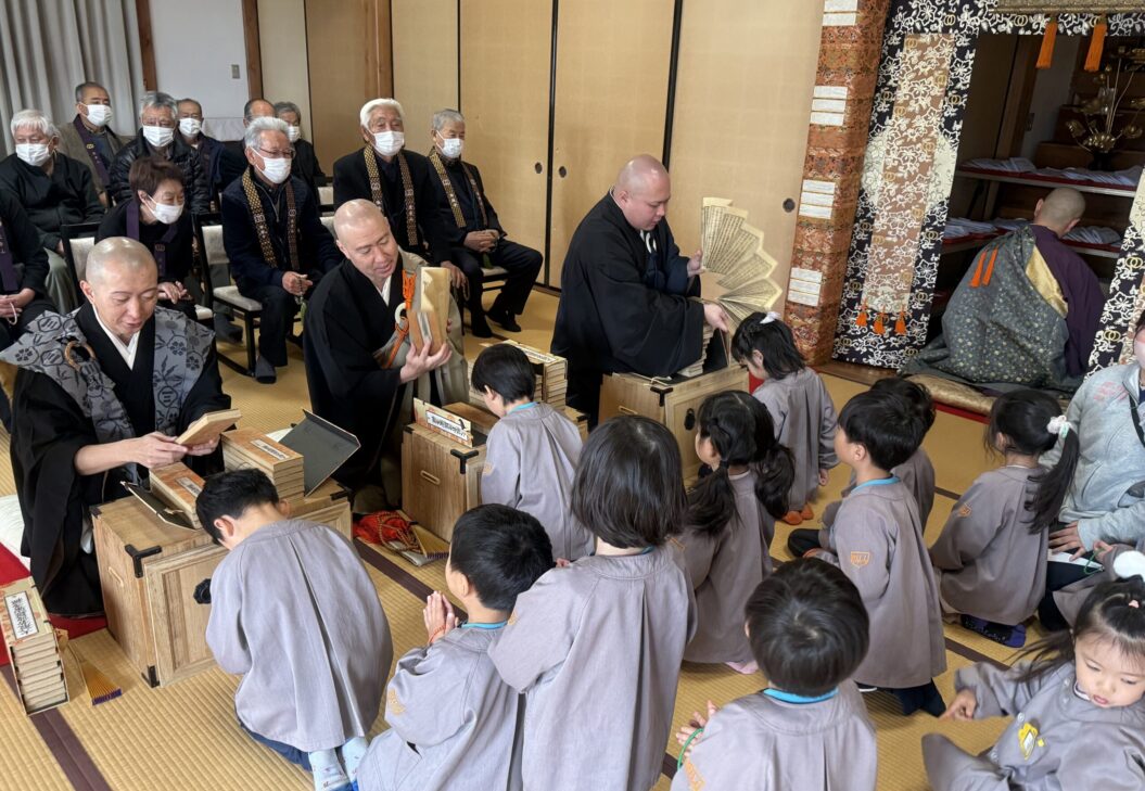 年長児を中心に、仏教行事に参加し心と体を整え、正座をして背筋を伸ばし、朝と夕方に落ち着きのある心と、相手を敬う「おもてなしの心」を育みます。静寂の中で集中力を高める、大切なひとときです。