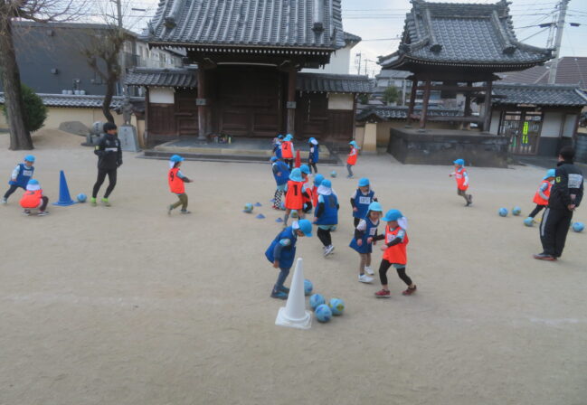 専門の講師を招き、月に1度サッカー教室やリズム体操を定期的に開催しています。ルールを守りながらチームで協力する楽しさや、音楽に合わせて体を動かす喜びを体験します。広い園庭でのびのびと活動することで、丈夫な体と、何事にも挑戦する意欲を養います。